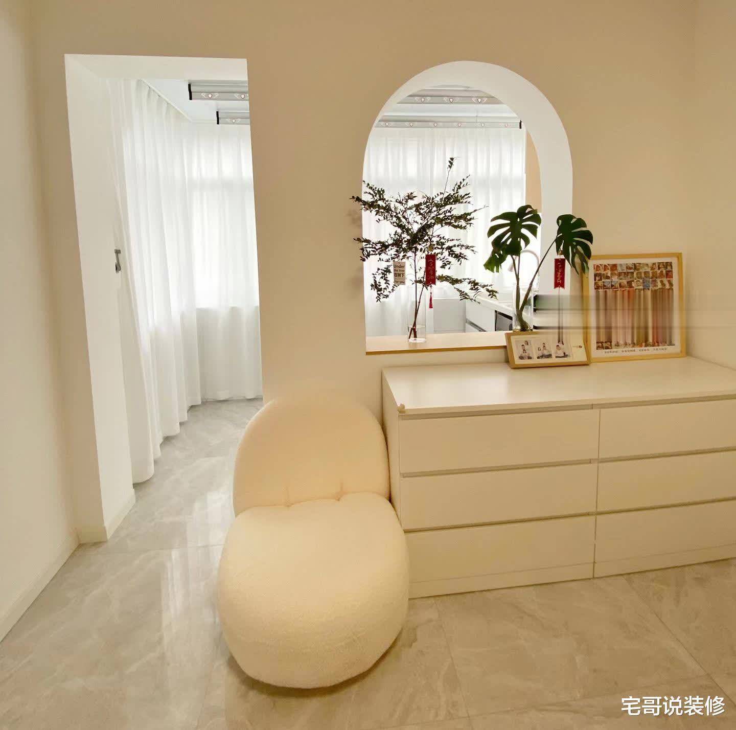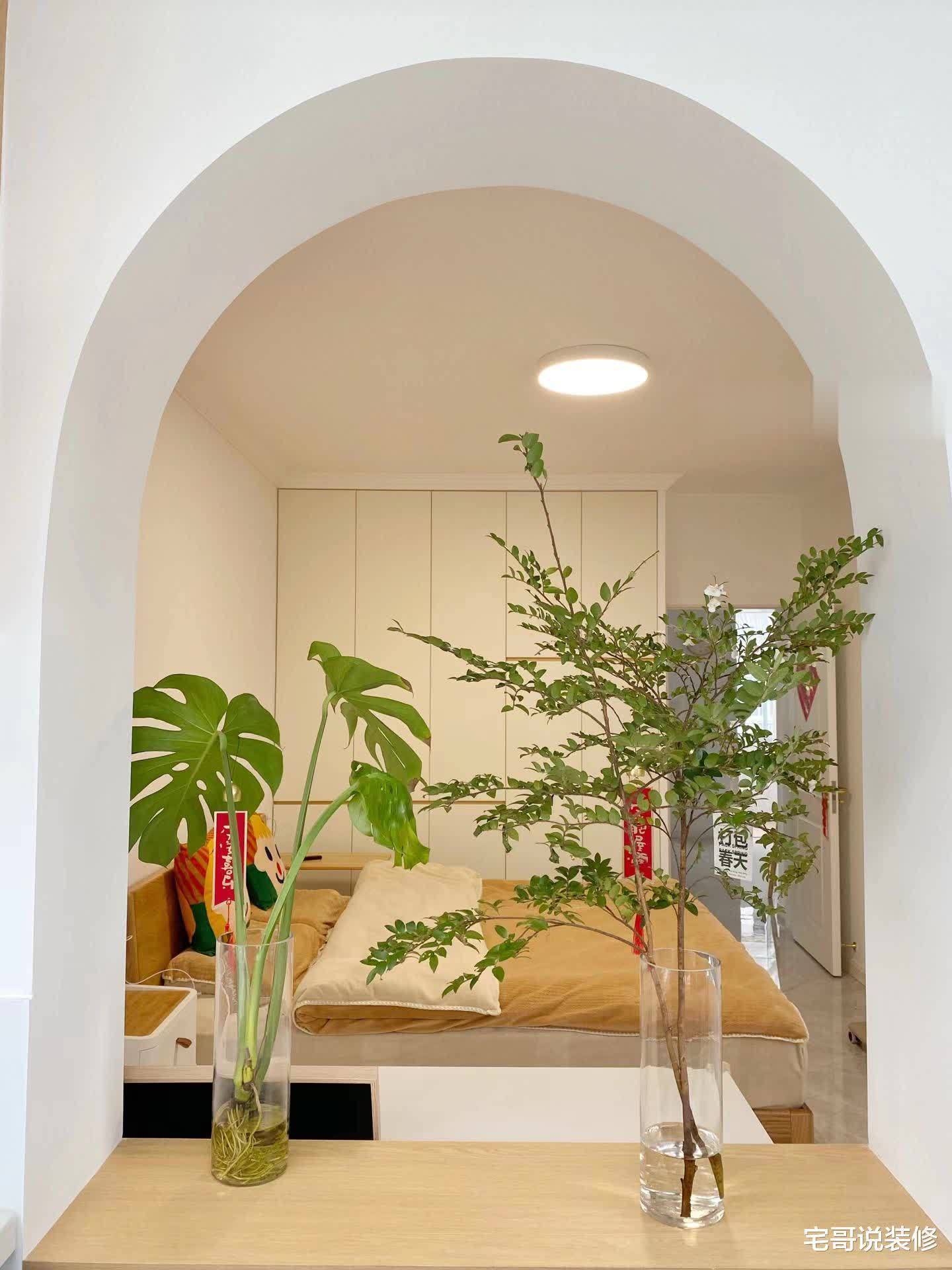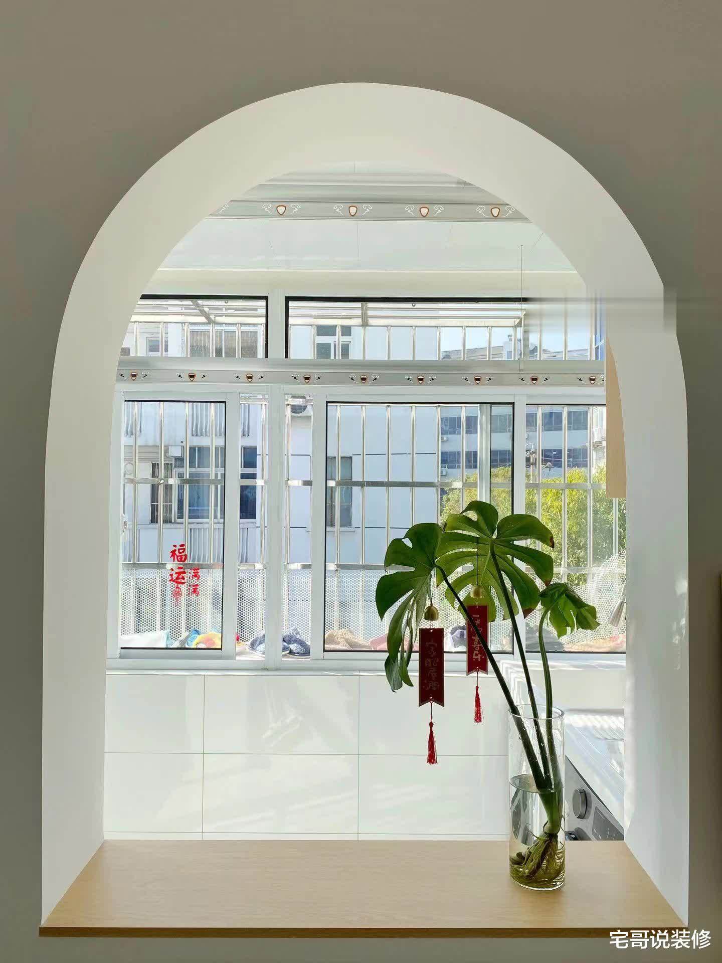 拱形的窗洞不仅替代了原来老旧难看的窗户,给室内提供采光和通风,而且还非常的美观,摆放上两瓶绿植,清新又大气。