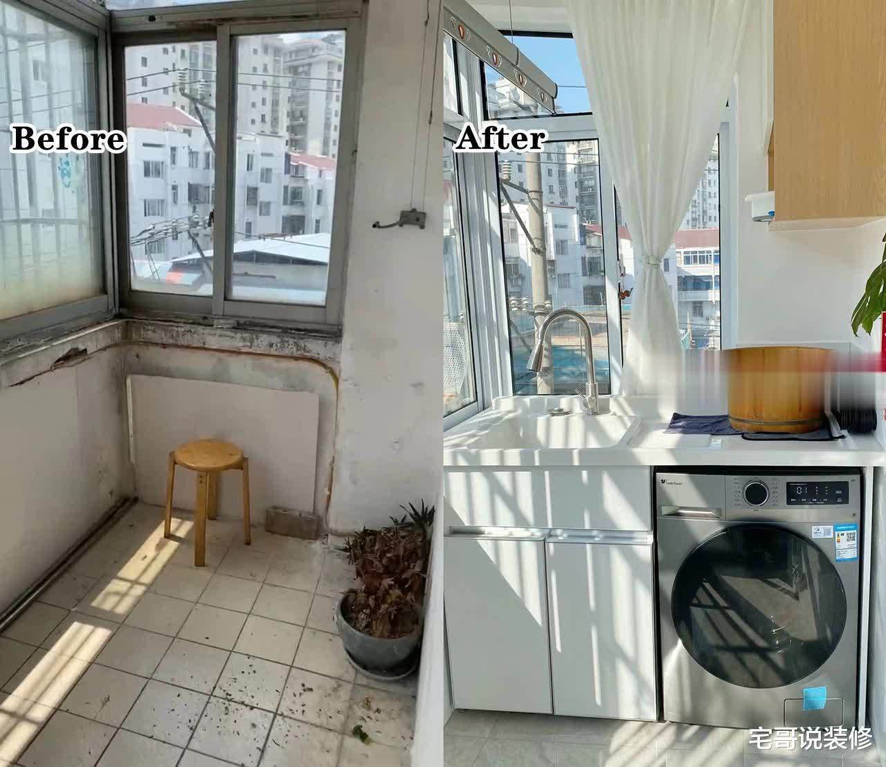 改造前的阳台空间基本上就只能简单的晾晒衣物,空间利用得并不充分;改造后增设了洗衣机柜,洗衣晾晒一步到位。