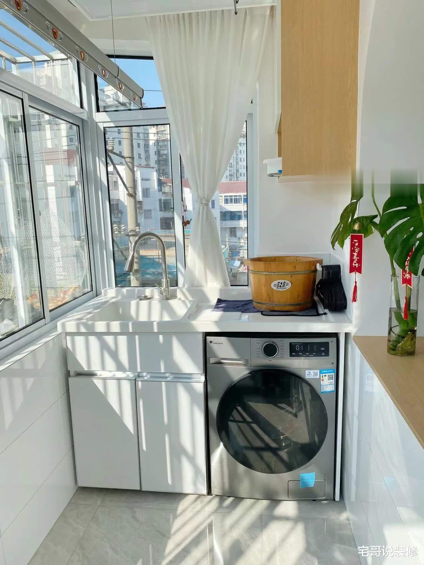 阳台的角落里设计了洗衣机柜,下方嵌入了带烘干功能的洗衣机,旁边还预留的手洗的区域。