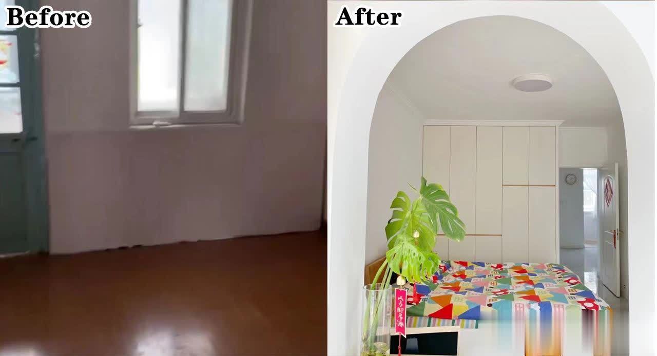 改造前主卧和阳台之间有门和窗户隔断,让空间显得比较昏暗;改造后窗户改成了开放式的拱门造型的窗,并且还拆掉了旁边的门,卧室变得更加宽敞明亮了。