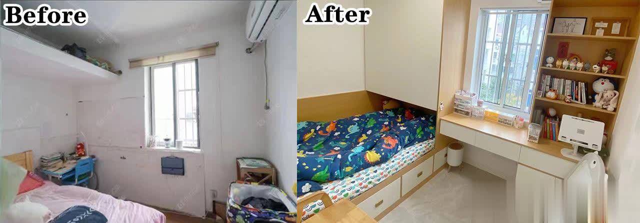 改造前的次卧只能放下一张床,收纳只能靠床下空间和床上的小隔层,不仅杂乱,而且非常压抑。