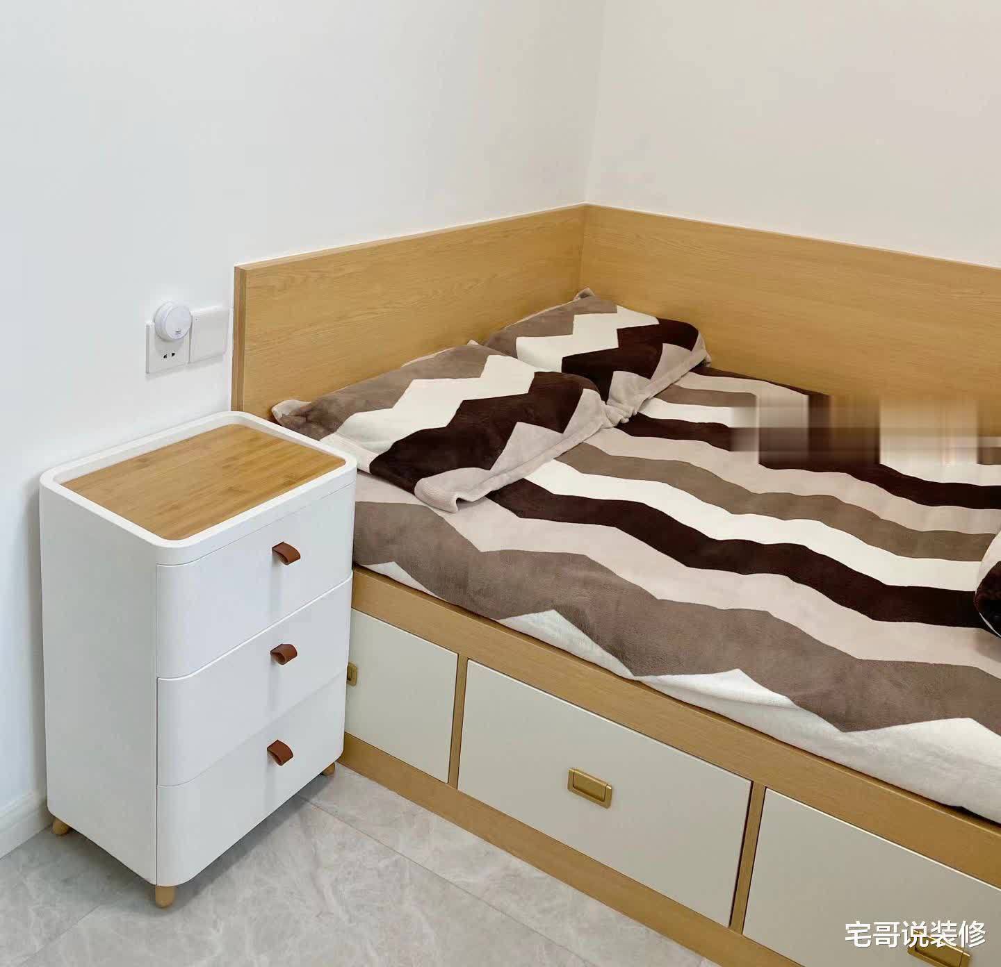 床头一侧还摆放了一组成品的半高柜充当床头柜,方便又实用。