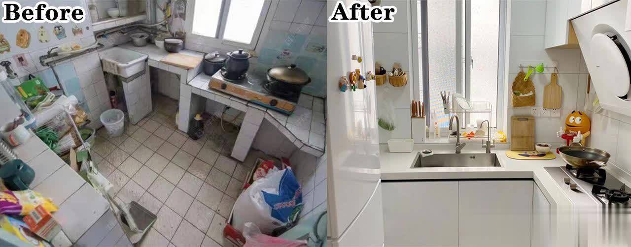 改造前的厨房非常老旧,并且缺乏收纳空间,所以看起来非常杂乱;改造后的厨房不仅更加好看了,而且收纳空间也非常的充足。