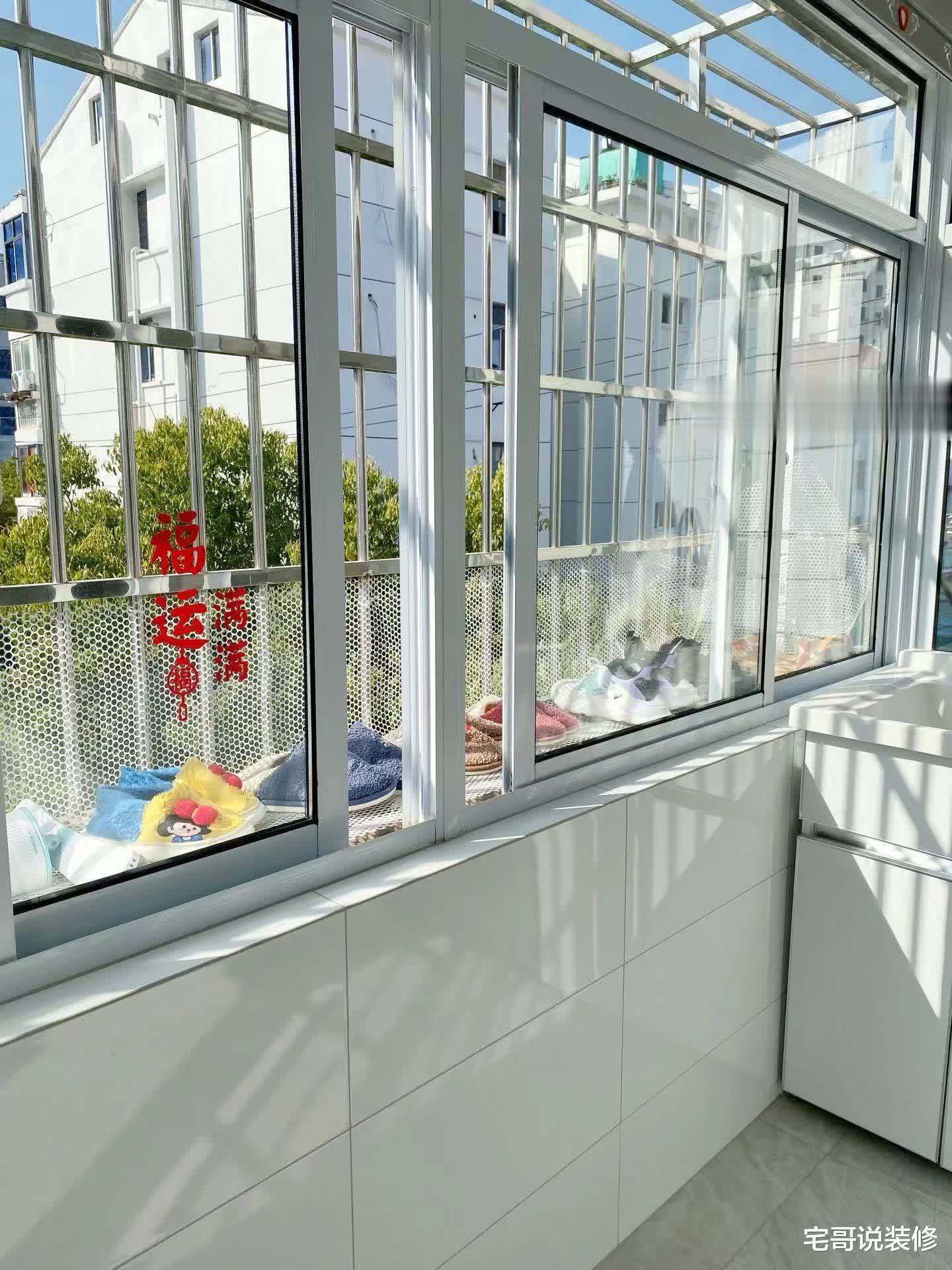 窗户外的不锈钢防盗架下方的平台,装上一层细网,用来晾晒鞋子非常方便,上方可以用来晾晒衣物。