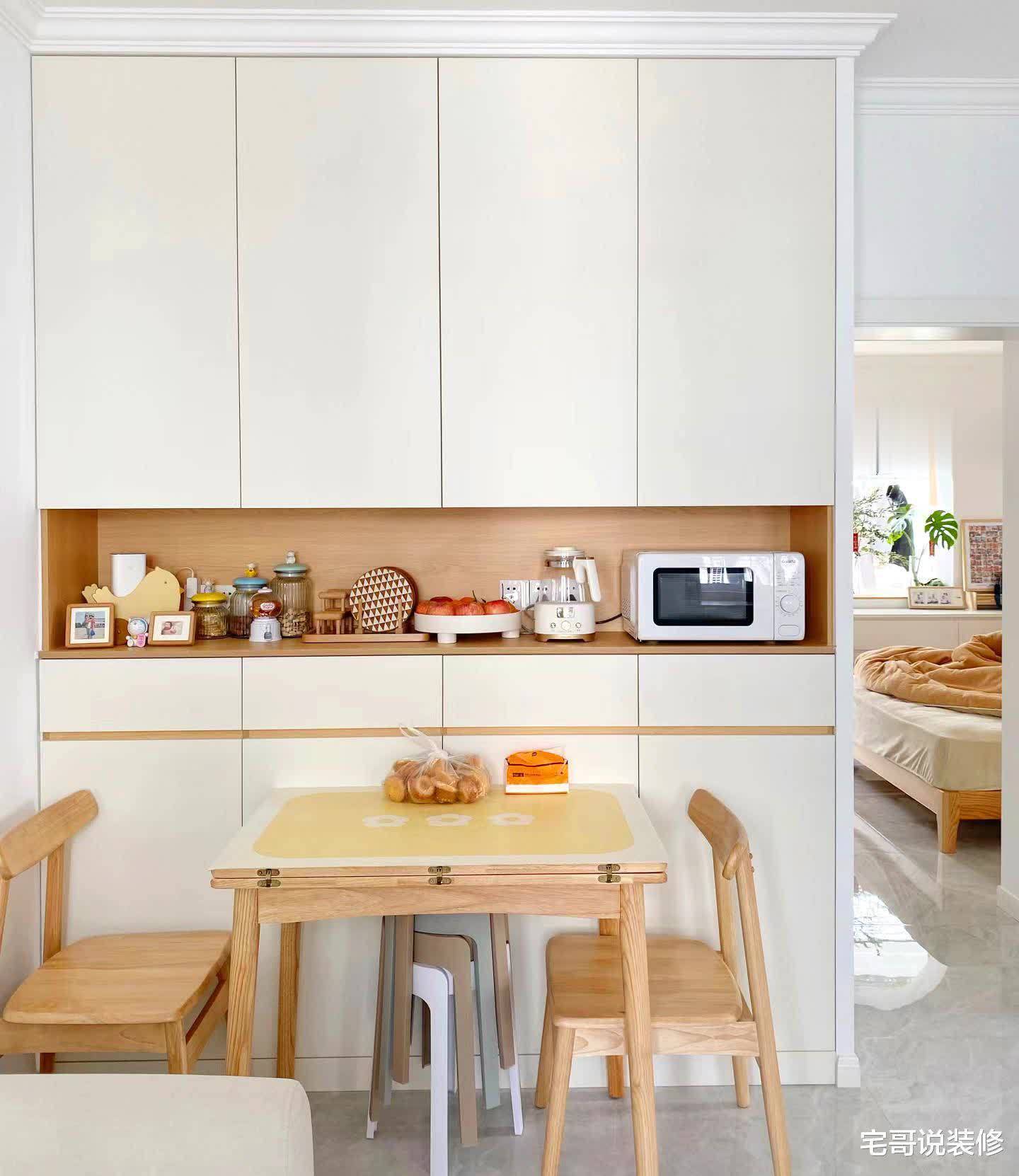一张小餐桌靠着餐边柜摆放,平时一家3口就餐非常方便,也不会占用太多空间。