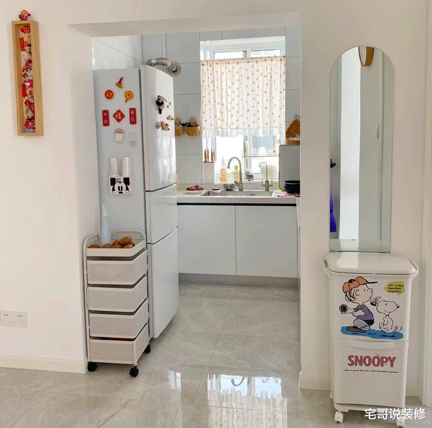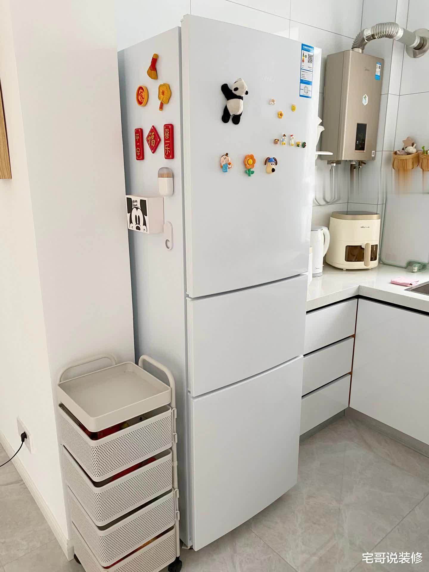 冰箱靠墙放置,旁边还摆放了一组带滑轮的收纳架,可以用来收纳一些不宜放在冰箱保持的食物,要用的时候可以拖到厨房的任意位置,平时靠墙摆放也不会占用太多空间,非常实用。