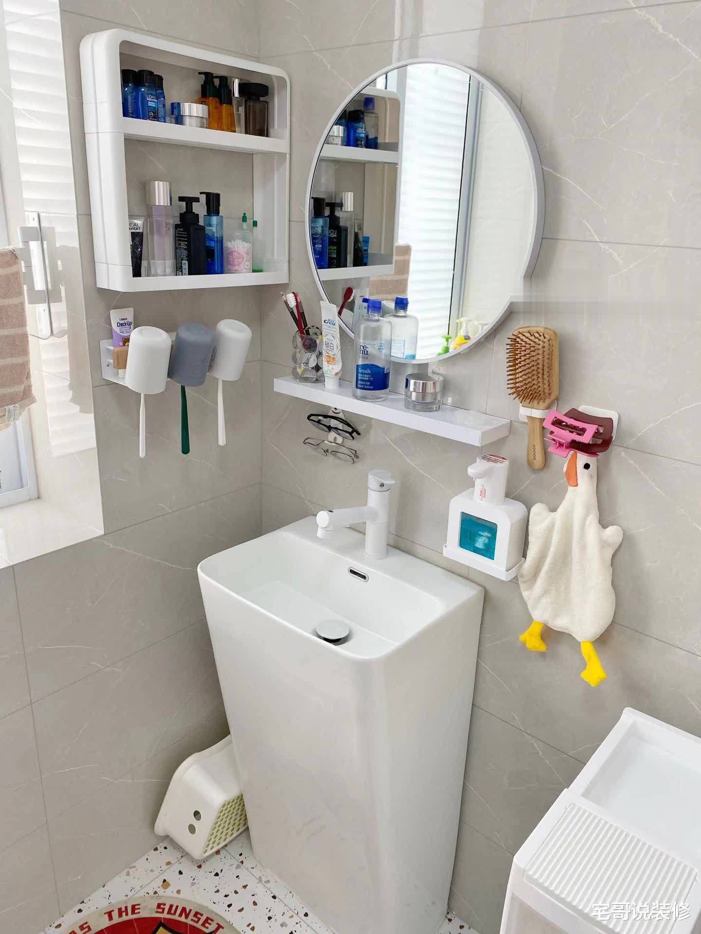 为了使用时间更长久,所以选择了一体式的陶瓷台盆,并巧妙的利用墙面空间来收纳洗漱用品和女主人的护肤品,整个角落小巧又很实用。