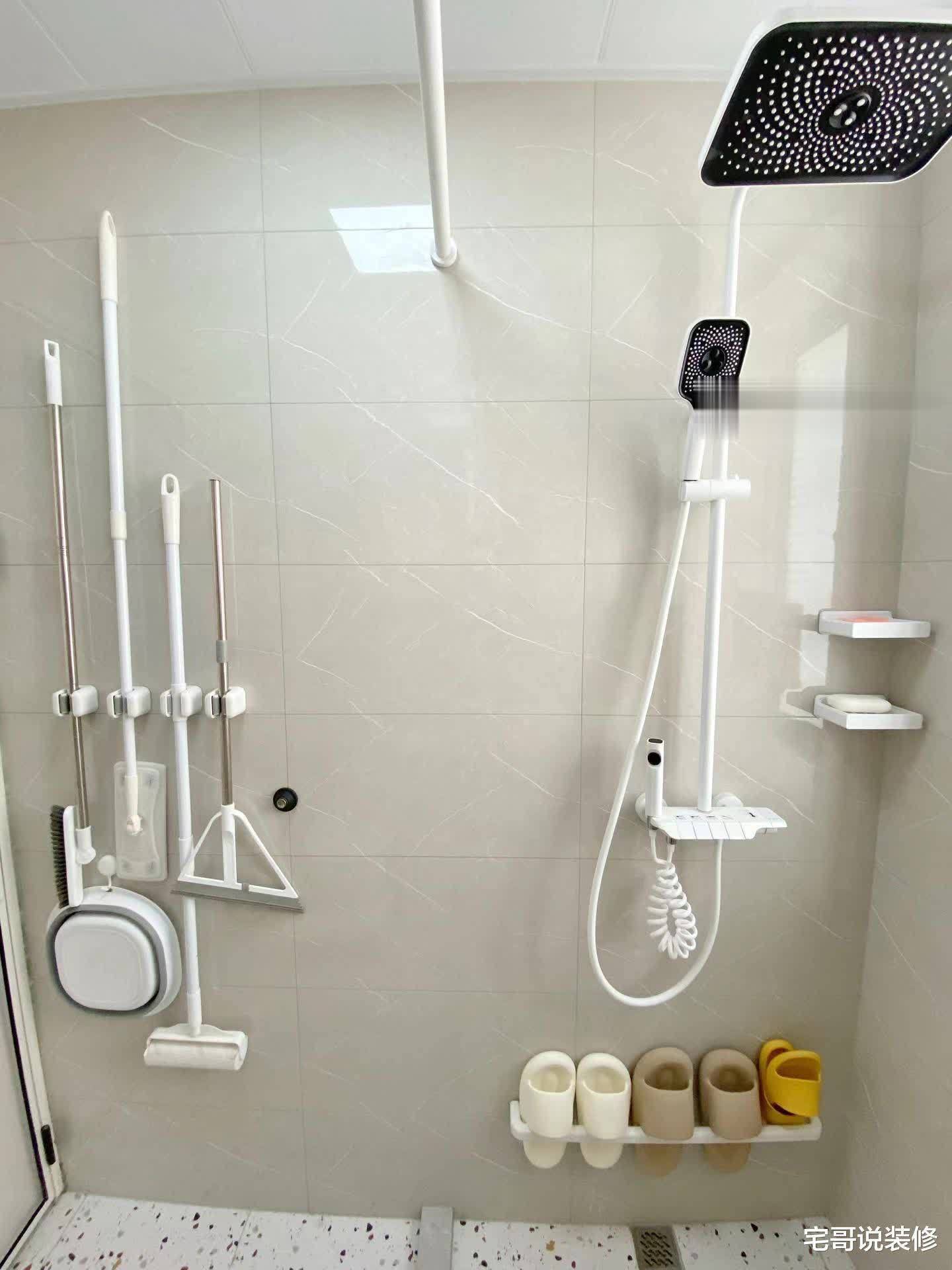 卫生间对面的墙面空间也没有浪费,门后空间安装了挂钩收纳清洁用具,花洒下方安装了拖鞋沥水架,都是非常实用的。