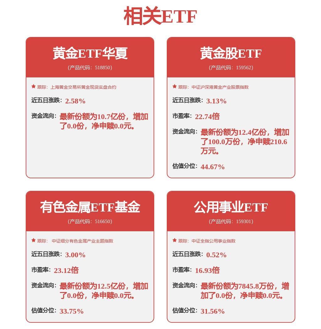 12月1日,受上周五金价铜价走强千层金配资,白银暴涨带动,黄金股有色概念强势领涨,黄金有色相关ETF纷纷异动,截至9:40,黄金ETF华夏(518850)涨1.19%,黄金股ETF(159562)涨3.9%,其持仓股白银有色、湖南白银双双涨停,江西铜业股份、六福集团、豫光金铅等股纷纷走强,有色金属ETF基金(516650)涨3.75%。