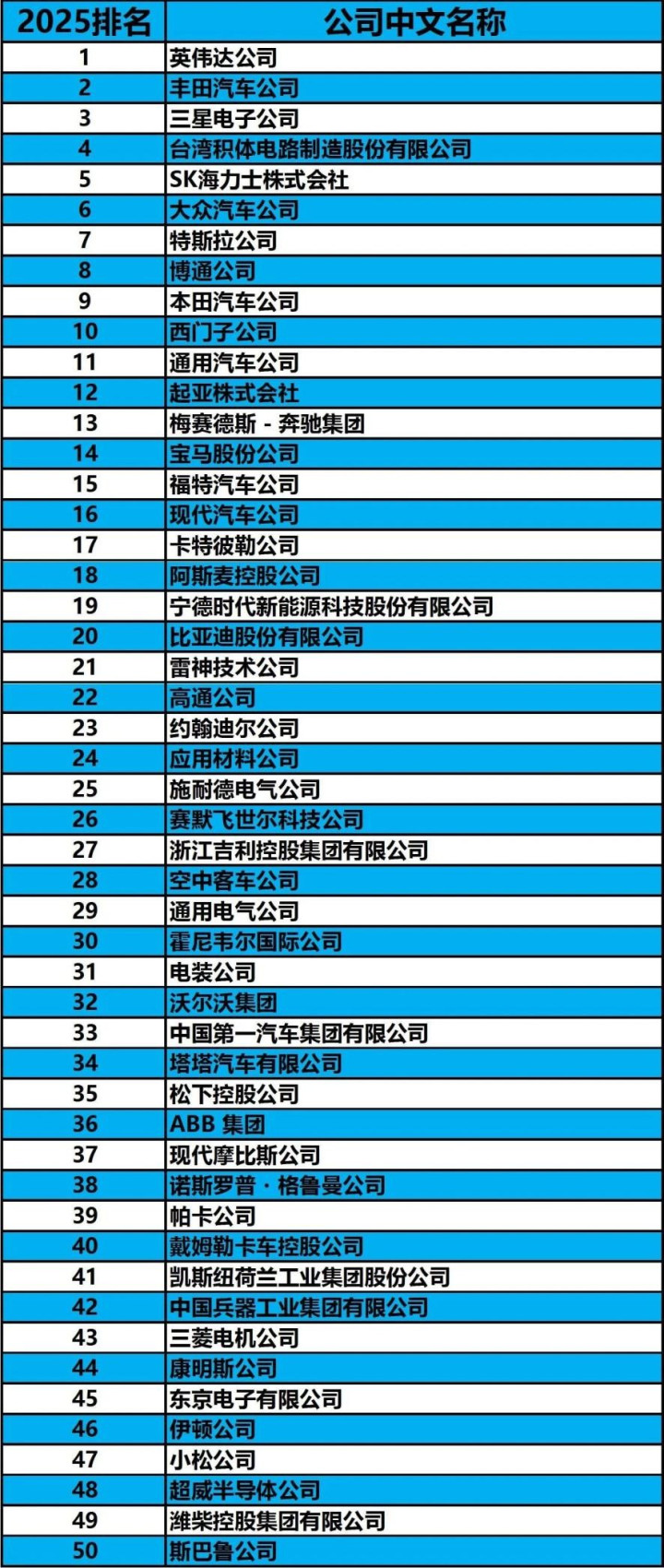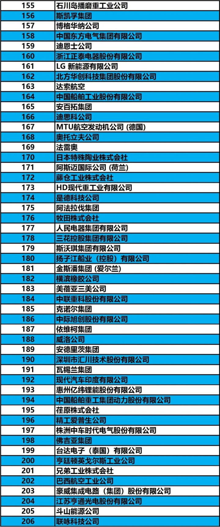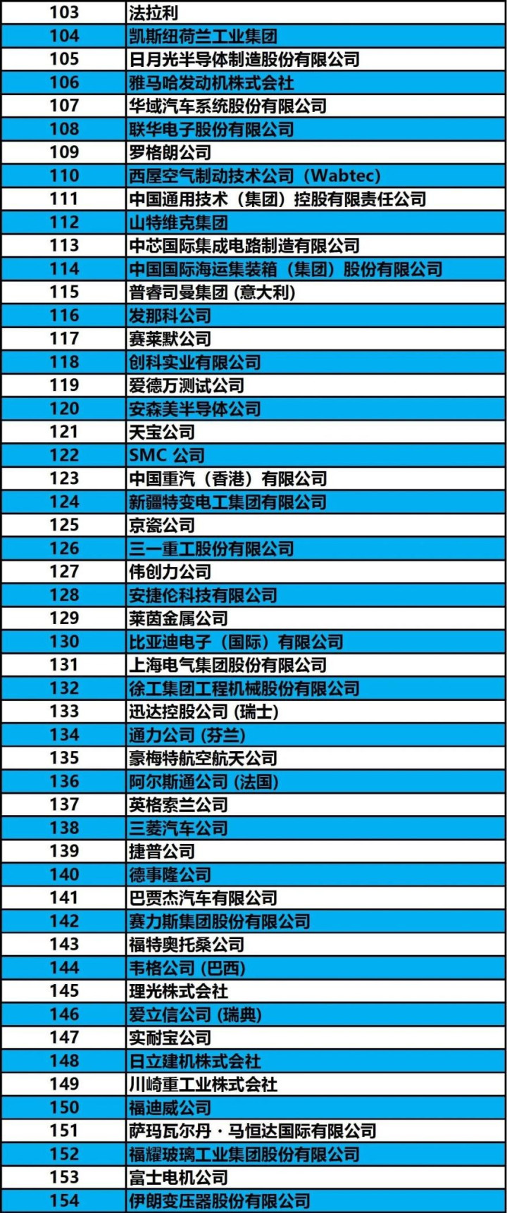 中国位居第一,上榜企业数量达到151家(含港澳台地区)。其中,电子设备48家,汽车制造34家,电气设备13家,通用机械11家,工程机械10家,电池制造、交通装备各有9家,台积电(4)、宁德时代(19)、比亚迪(20)、吉利控股集团(27)、一汽集团(33)、中国兵器工业集团(42)、潍柴集团(49)跻身TOP50。