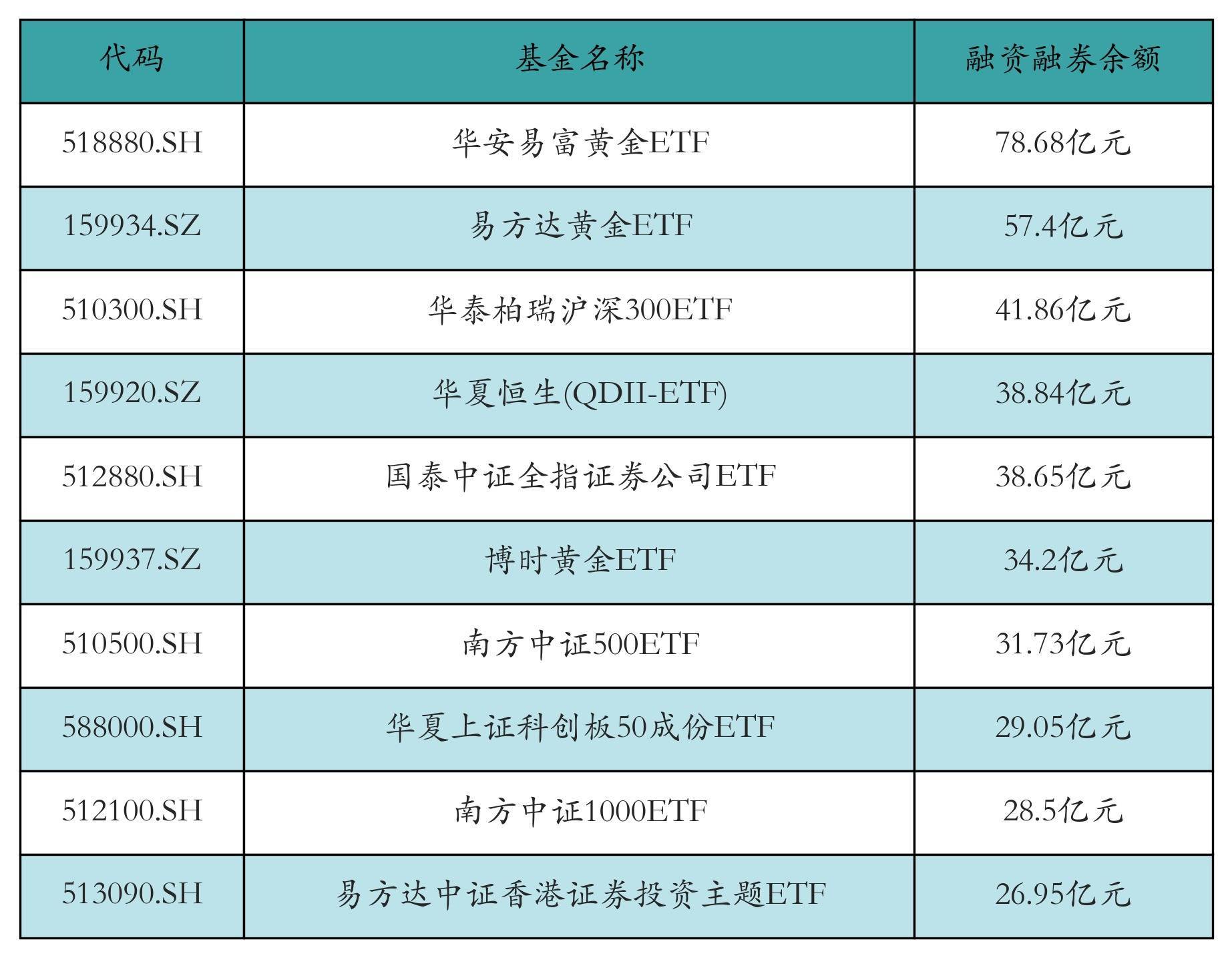 12月1日ETF两融余额前三位分别为:华安易富黄金ETF(78.68亿元)、易方达黄金ETF(57.4亿元)和华泰柏瑞沪深300ETF(41.86亿元),前10具体见下表: