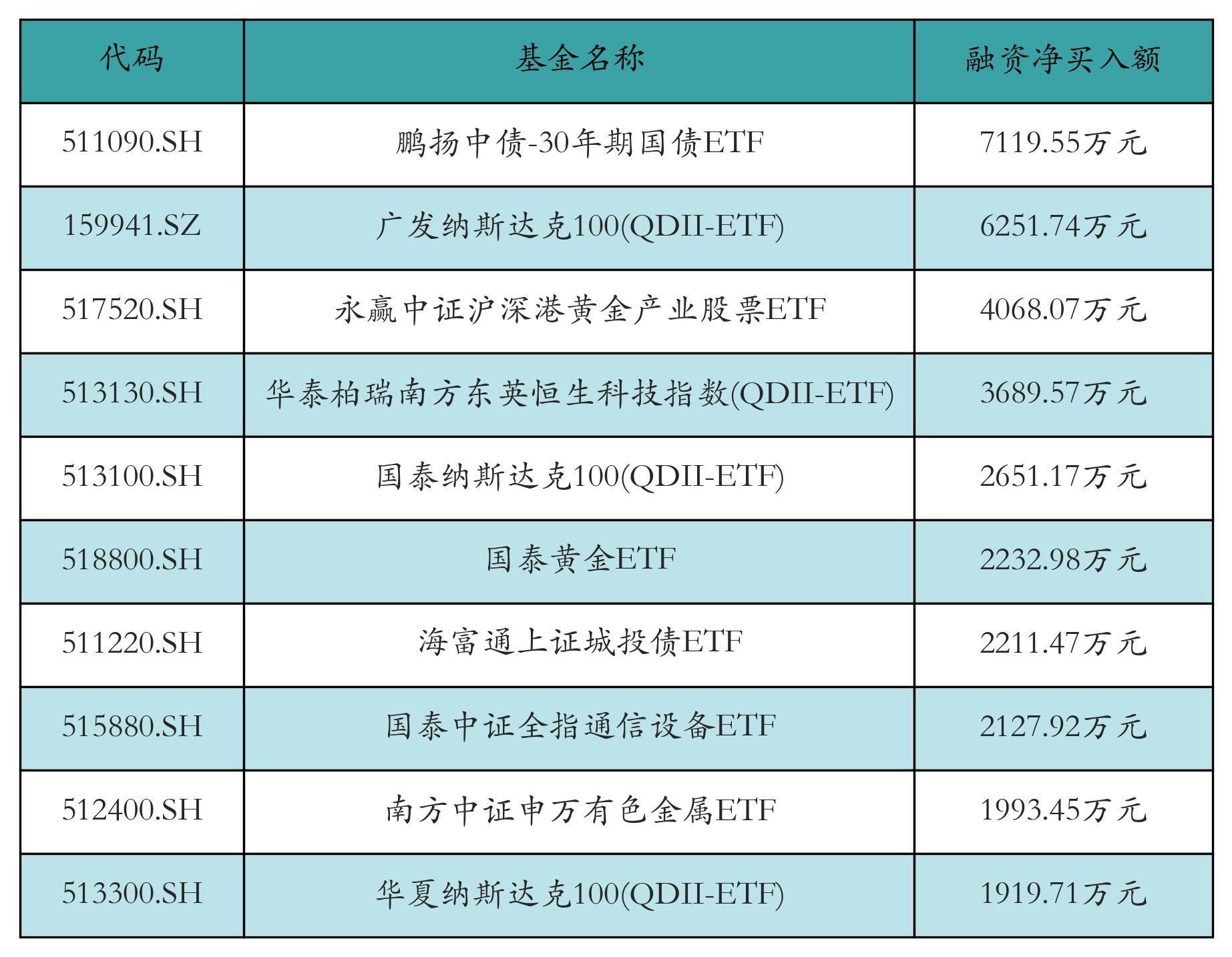 12月1日ETF融资净买入额前三位分别为:鹏扬中债-30年期国债ETF(7119.55万元)、广发纳斯达克100(QDII-ETF)(6251.74万元)和永赢中证沪深港黄金产业股票ETF(4068.07万元),前10具体见下表: