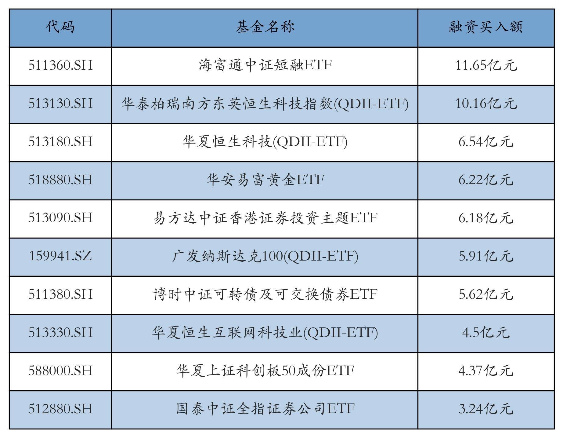 12月1日ETF融资买入额前三位分别为:海富通中证短融ETF(11.65亿元)、华泰柏瑞南方东英恒生科技指数(QDII-ETF)(10.16亿元)和华夏恒生科技(QDII-ETF)(6.54亿元)兴启网,前10具体见下表: