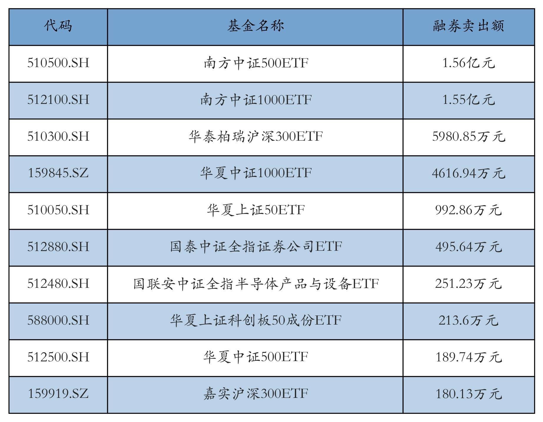 12月1日ETF融券卖出额前三位分别为:南方中证500ETF(1.56亿元)、南方中证1000ETF(1.55亿元)和华泰柏瑞沪深300ETF(5980.85万元),前10具体见下表: